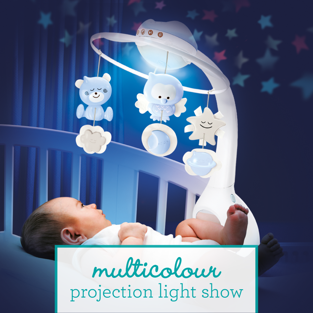 適合初生寶寶使用 設有3種不同用法 20分鐘自動停止播放功能 可投射影像於牆壁上 音樂或自然聲音的選擇:包括6種旋律和4種自然聲音。 音量控制:選擇音量級別(包括靜音在內的6個級別) Age grade 0 month+ 3 uses: Crib mobile, crib projector, table top projector Plays soothing music with a 20-minute auto shut off Projects a starry sky onto the ceiling Features a peek-a-boo mirror Music or Nature sound selection Includes 6 melodies and 4 natural sounds. Volume control Select volume level (6 levels including MUTE)