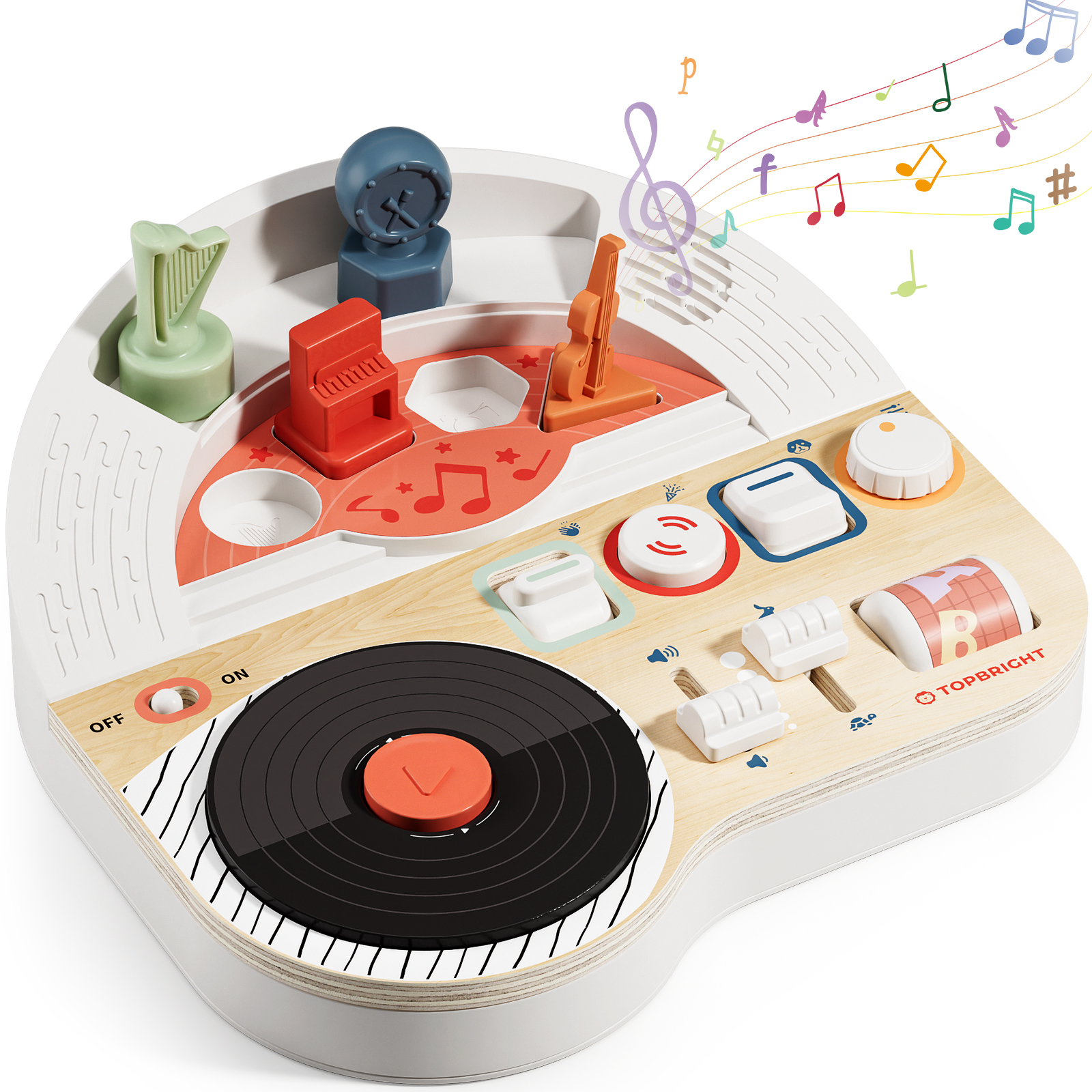 This musical busy board for toddlers combines hands-on play with sound discovery through 14 interactive sensory activities and 4 instrument blocks. Match the shapes to trigger instrument tones and stack pieces to layer sound tracks for creative play. Little hands can pull, press, turn, twist, plug, and slide to build coordination and finger strength. Made with beech plywood and ABS, it is designed for everyday play and easy exploration.