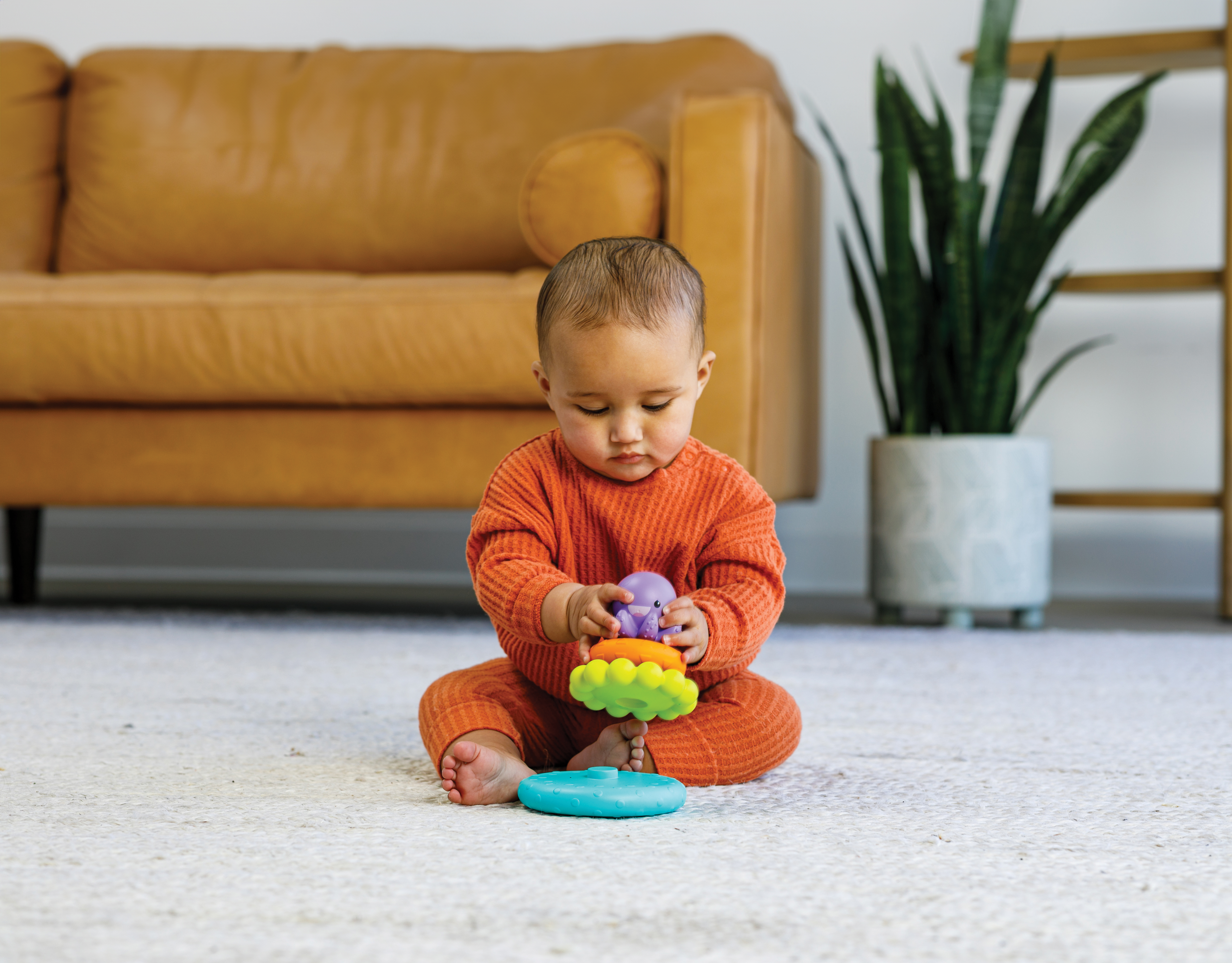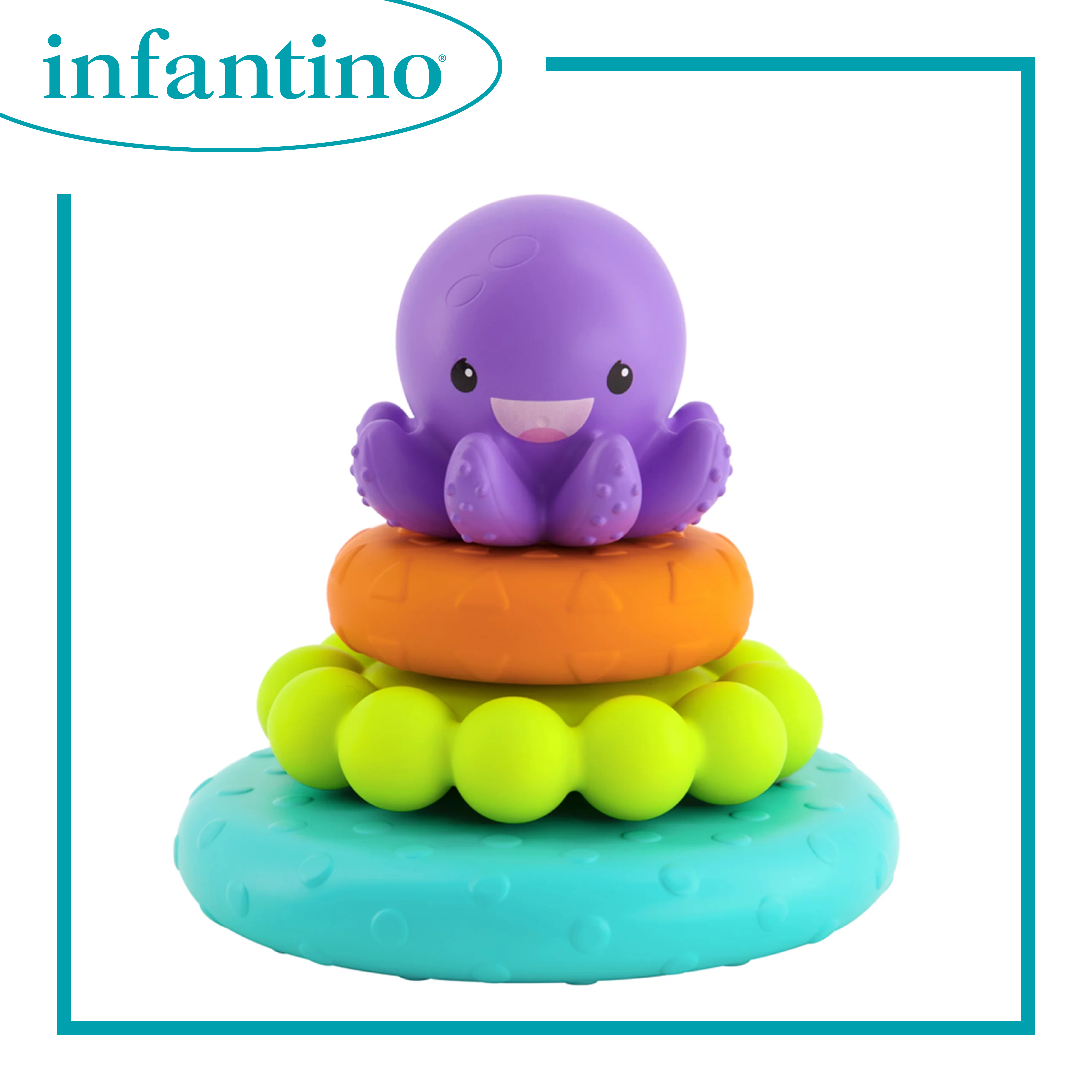 包括 1 個發光八爪魚及 5 個彩色投擲環 在八爪魚的觸手周圍拋擲環有助於發展大小肌肉的運動技能 觸手上必須觸摸的感官吸引紋理 當八爪魚放入水中時,會產生舒緩的燈光秀 浴缸內及其他地方的多功能遊戲可能性