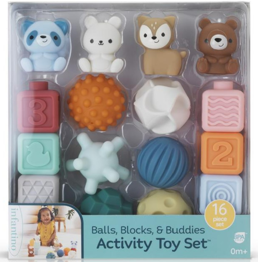 適合初生嬰兒使用 16 件柔軟可擠壓的玩具套裝 4 個可擠壓的小動物玩偶 6 個不同顏色、印有數字和形狀的積木 6 個易於抓握的紋理球 促進大運動技能發展 幫助寶寶發展觸覺