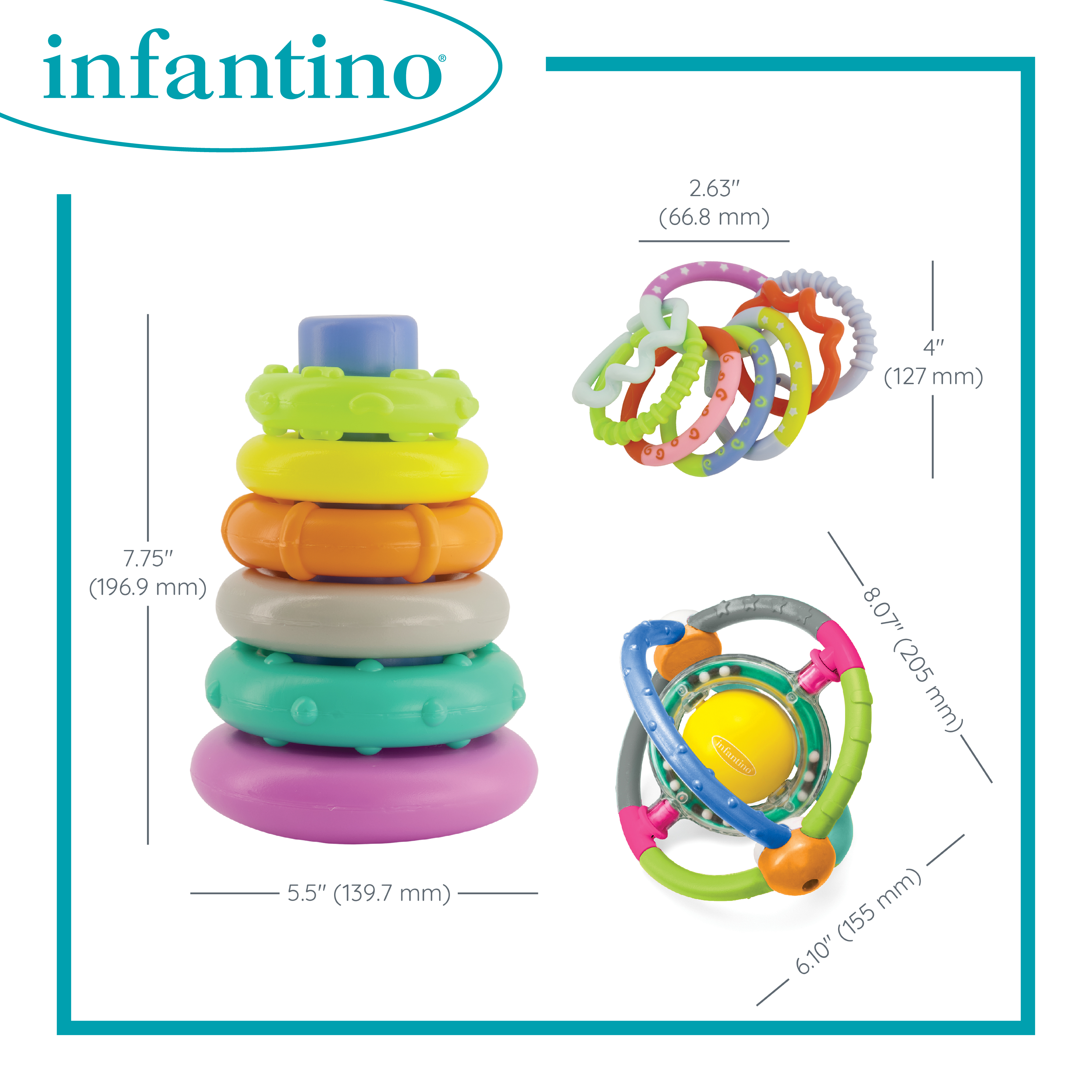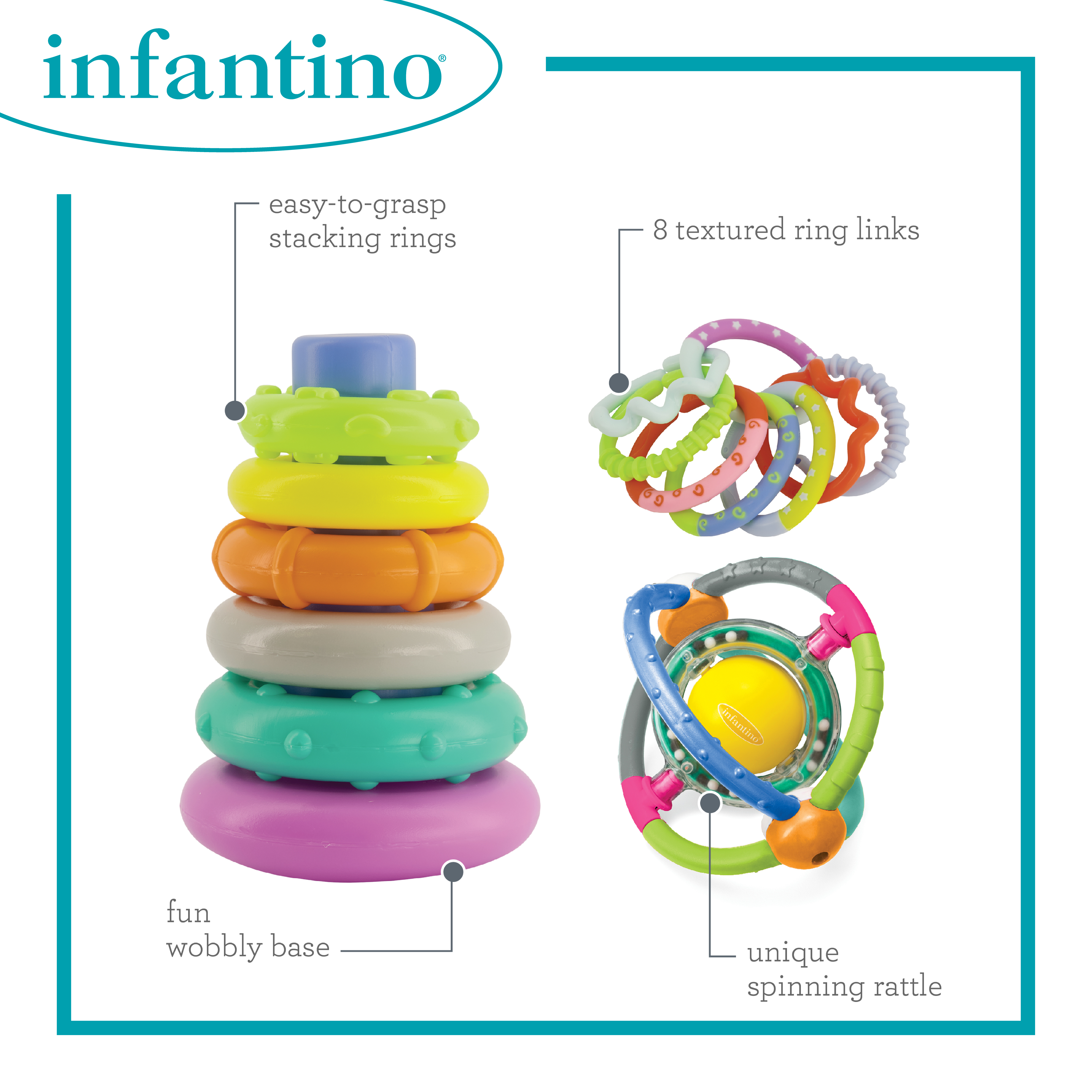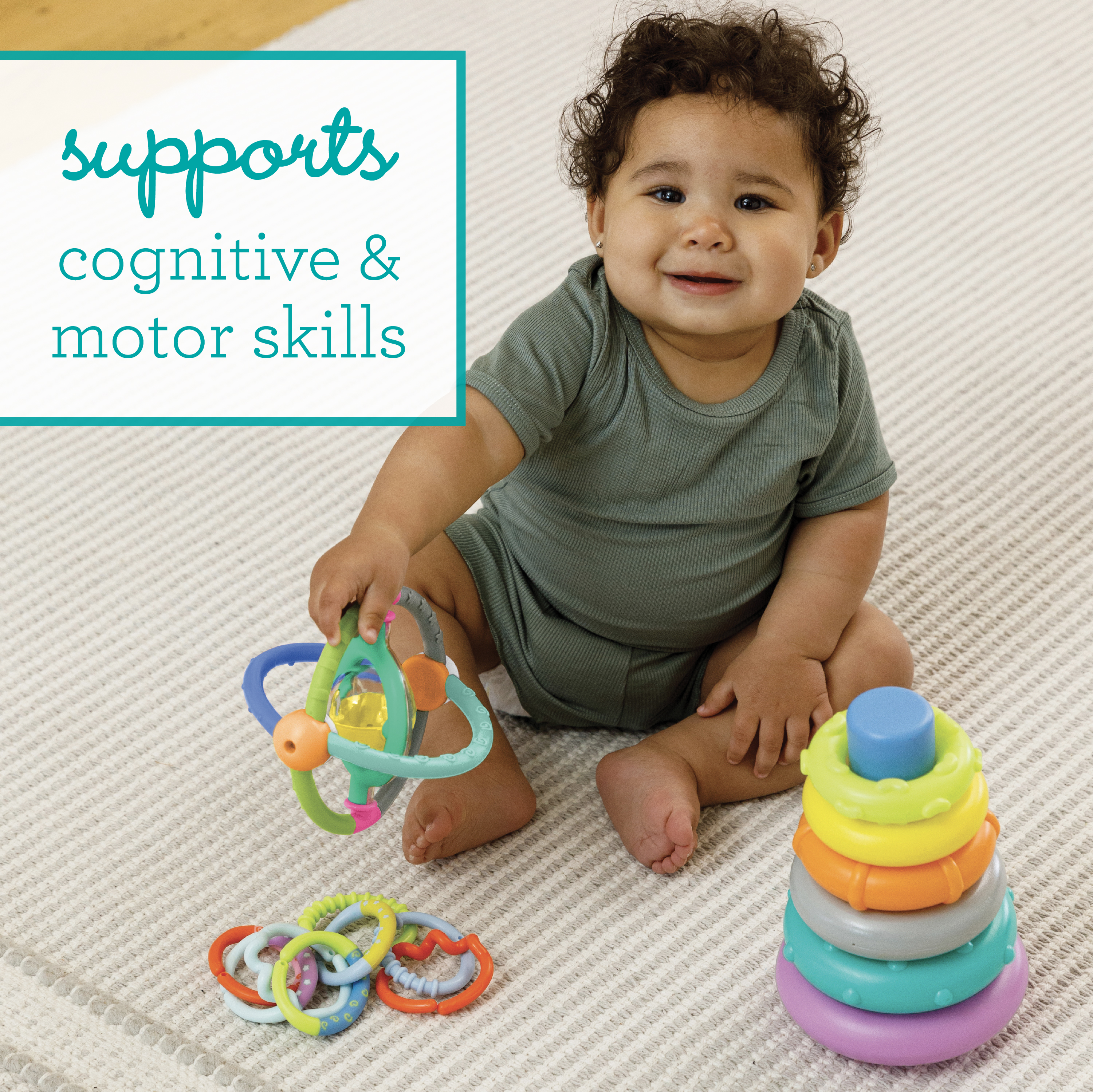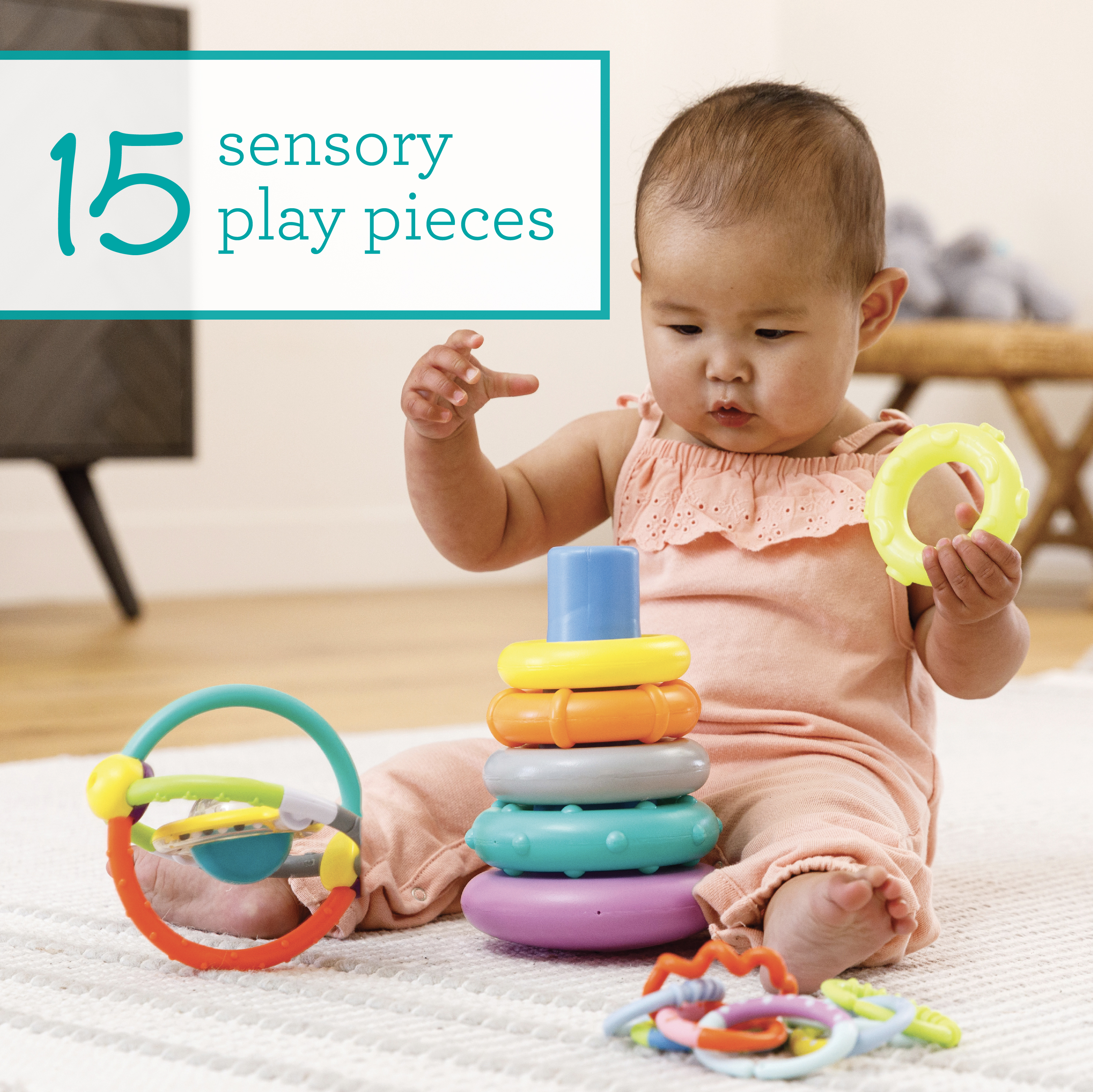 適合初生嬰兒使用 寶寶歡樂盒提供三種必備嬰兒玩具,包括 Rock 'n Rings、Orbit Rattle 和 Ring Links。 15 個色彩繽紛的玩具可以培養寶寶的精細動作和認知技能。 Rock n' Rings 有五個彩色圓環,可以堆疊在搖擺底座上。 Ring Links 包含八個尺寸完美的圓環,供您的寶寶探索令人興奮的紋理。 Orbit Rattle 是一種獨特的旋轉撥浪鼓,在搖動或旋轉時具有感官體驗。 對於想要給寶寶一些實用又有趣的東西的父母來說,這款玩具組是完美的禮物!