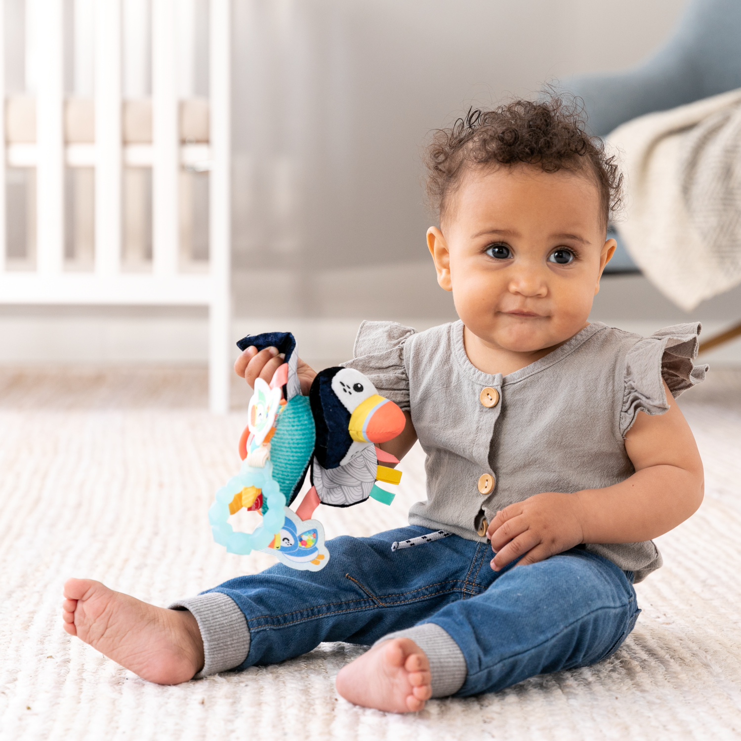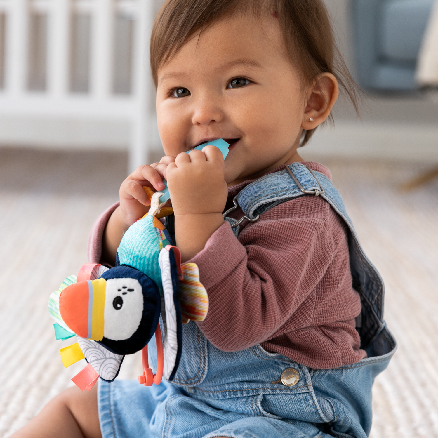 適合初生嬰兒使用 擠壓不同部位時發出舒適的沙沙聲 一個紋理牙膠,用於長牙時啃咬和咀嚼 聚酯/塑料 不含 BPA 局部清潔