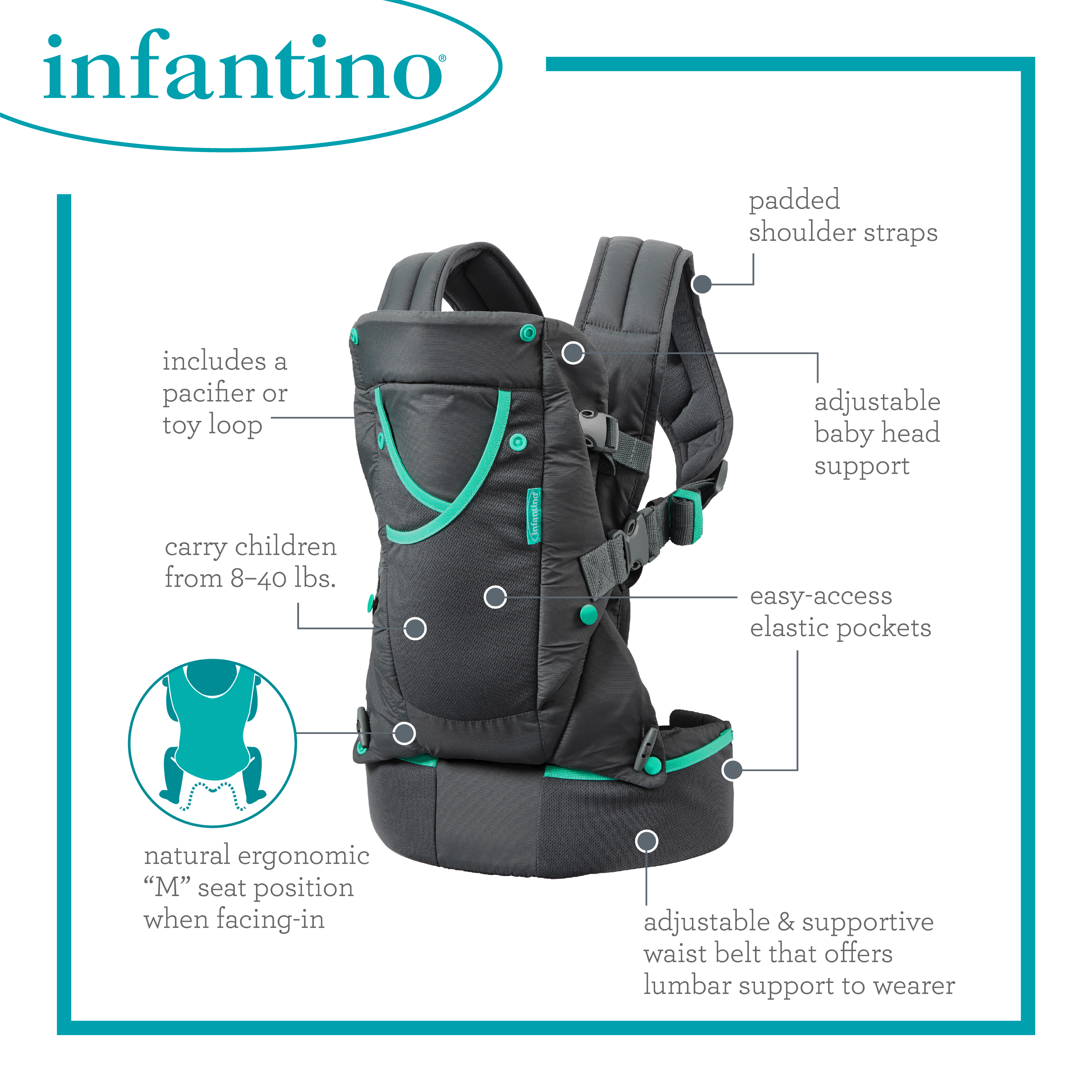 Infantino Carry On Active 多口袋嬰兒背帶專為嬰幼兒設計,可承重 8-40 磅(約 3.6-18.6 公斤)的體重。