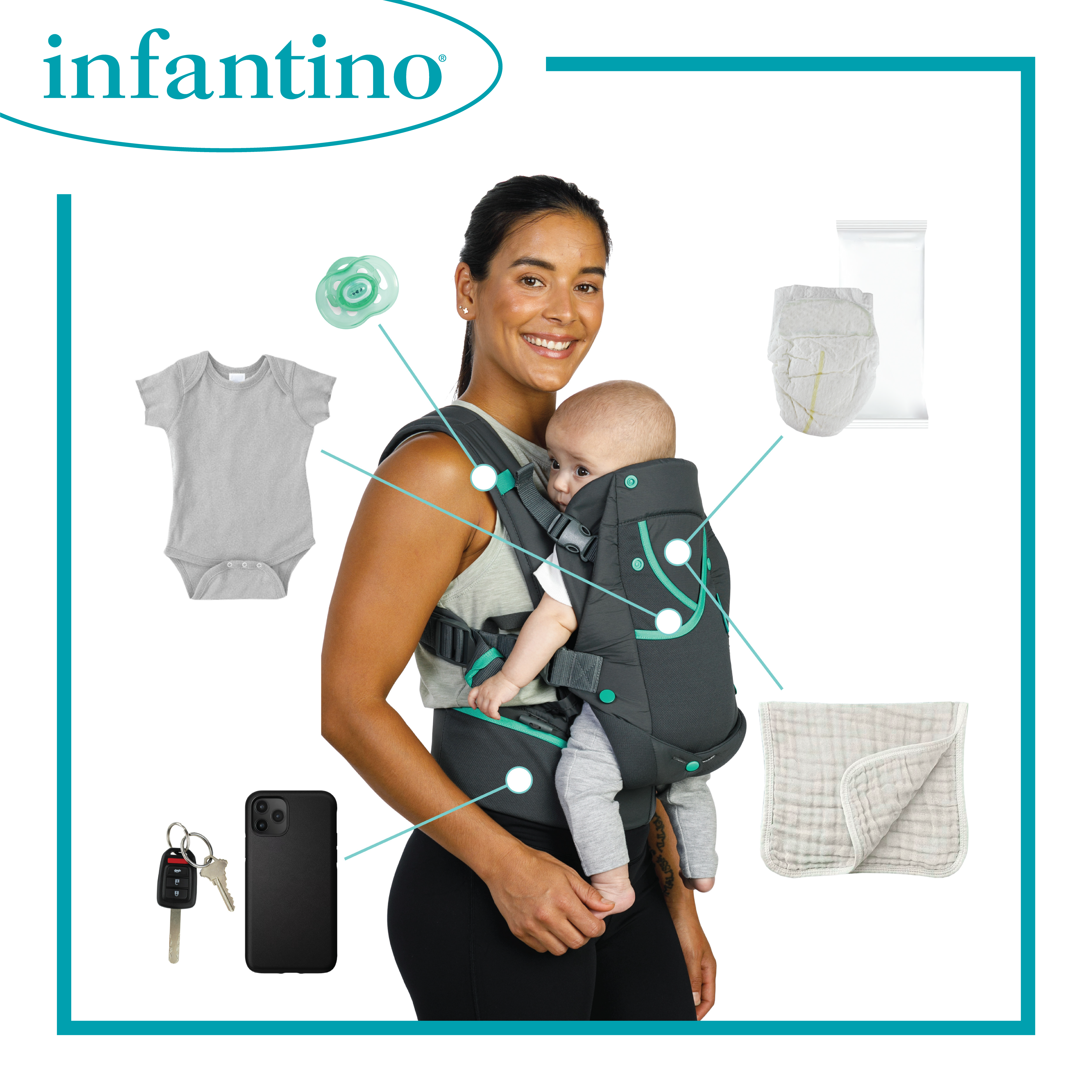 The Infantino Carry On Active Multi-Pocket Carrier is designed for infants and toddlers, adapting as they grow from 8-40 lbs.