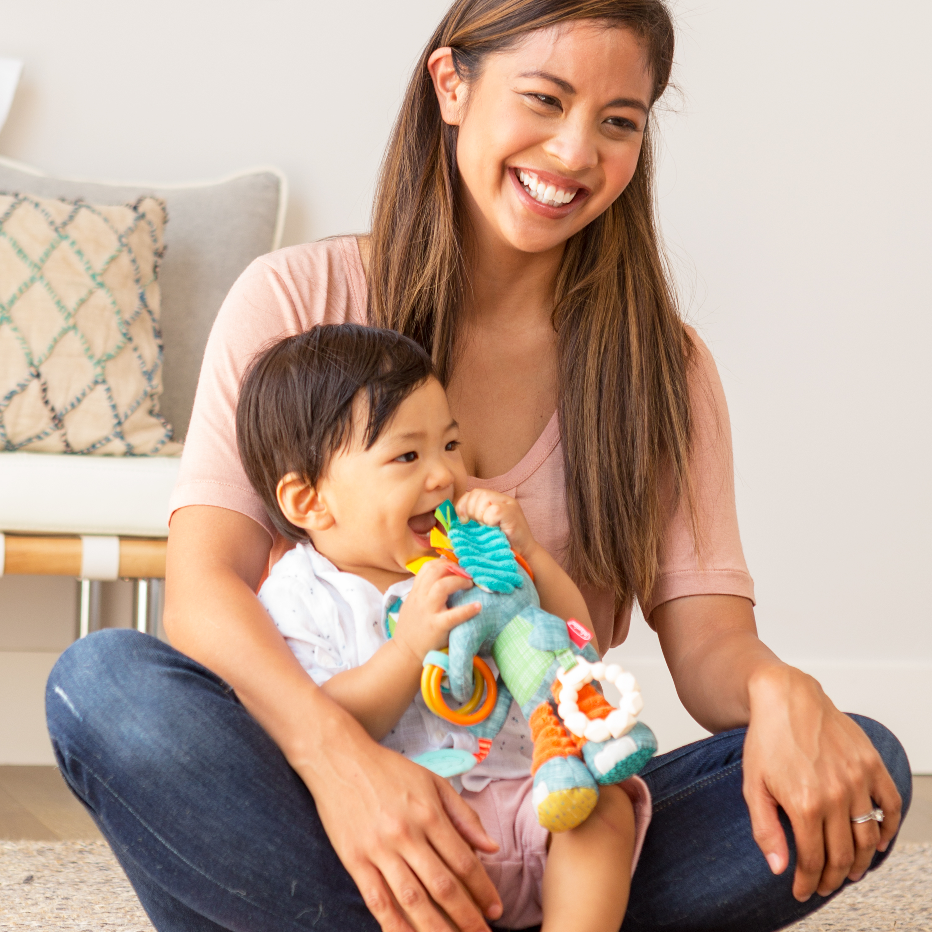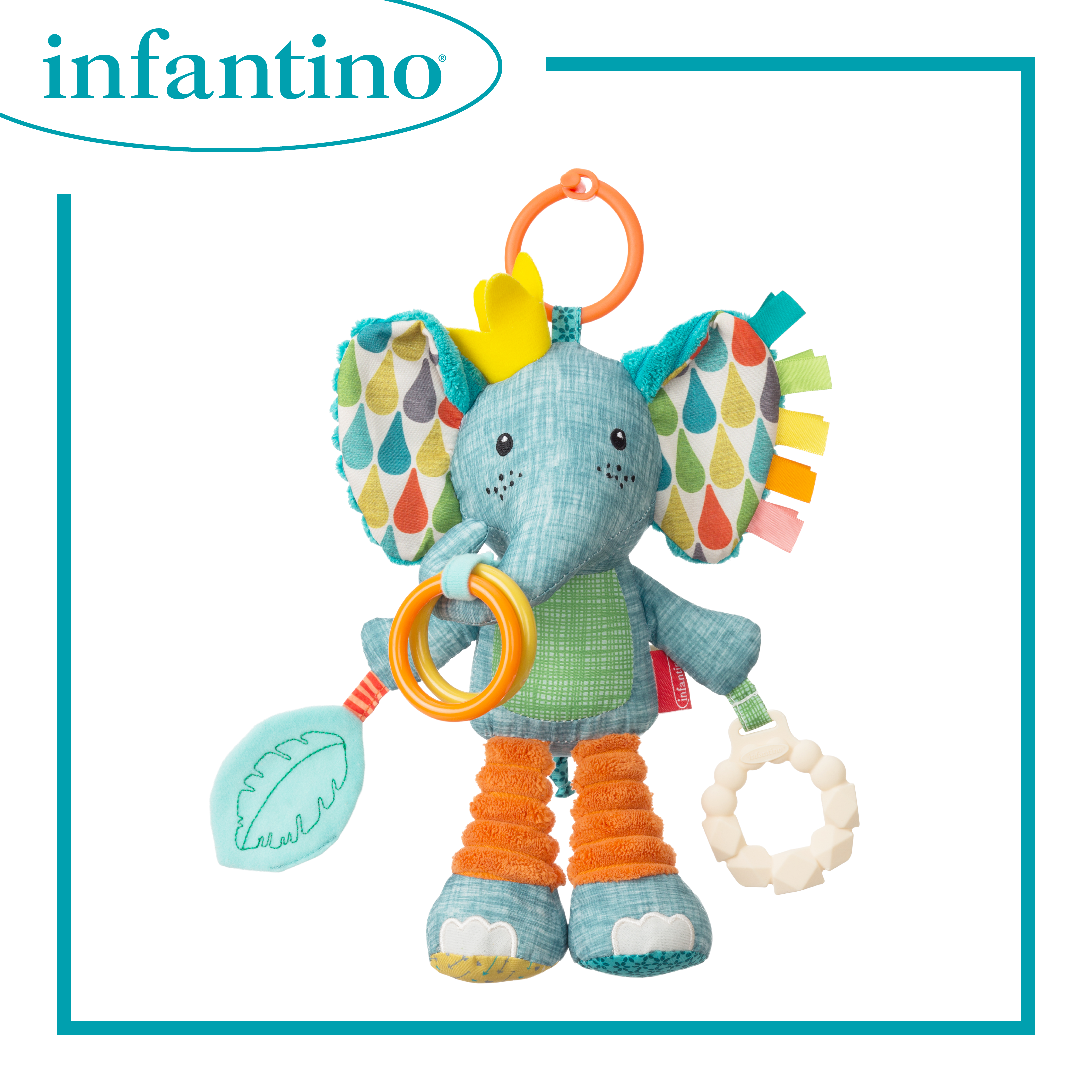 適合初生嬰兒使用 具有嘎嘎聲、皺紋、紋理和玩具 超柔軟的毛絨布料 包括不含 BPA 的矽膠牙膠 易於連接在汽車座椅、嬰兒車和遊戲墊
