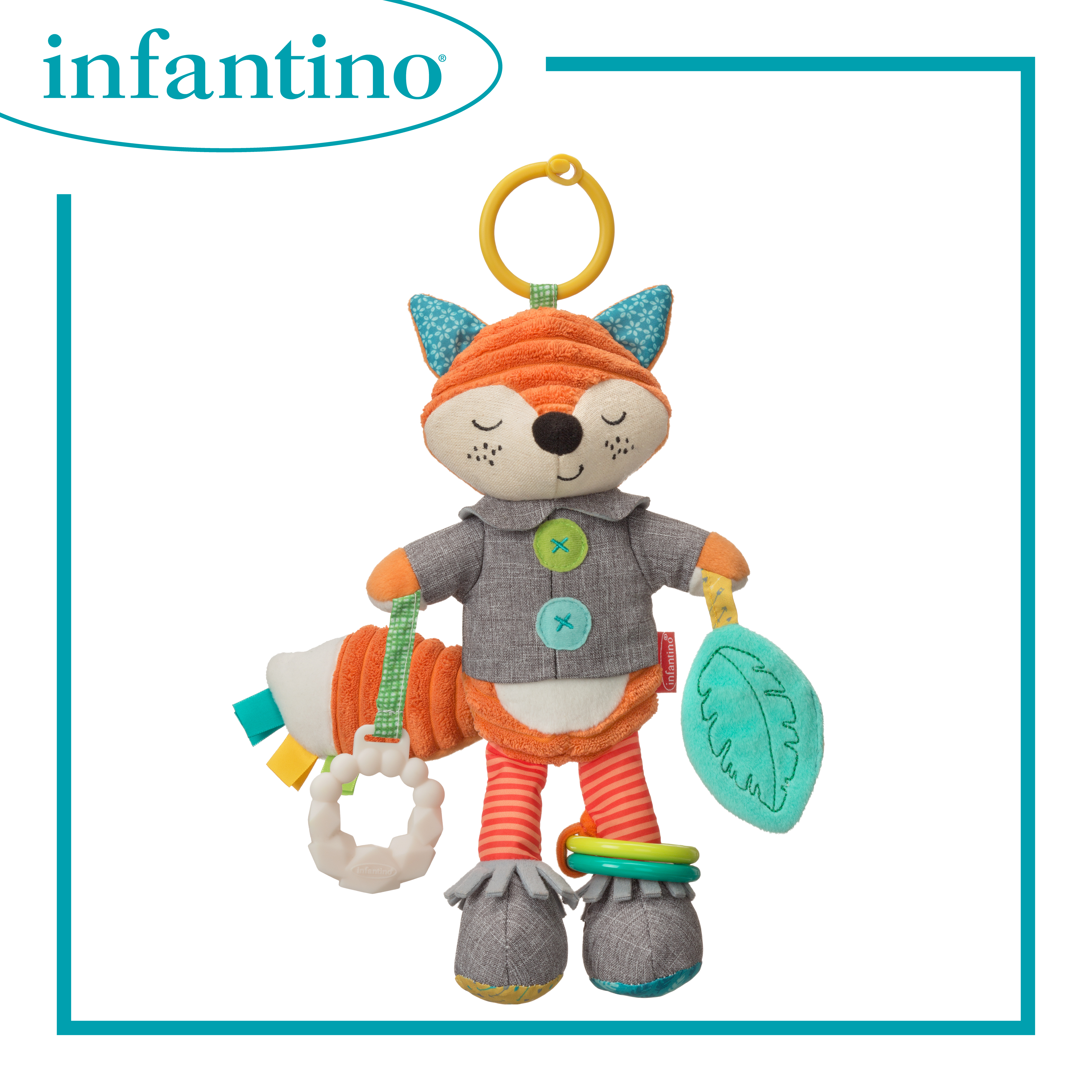 適合初生嬰兒使用 具有柔和搖鈴聲、皺紋紋理和玩具的特點 超柔軟的毛絨面料 包括不含 BPA 的矽膠環牙膠 易於安裝在汽車座椅或嬰兒車上