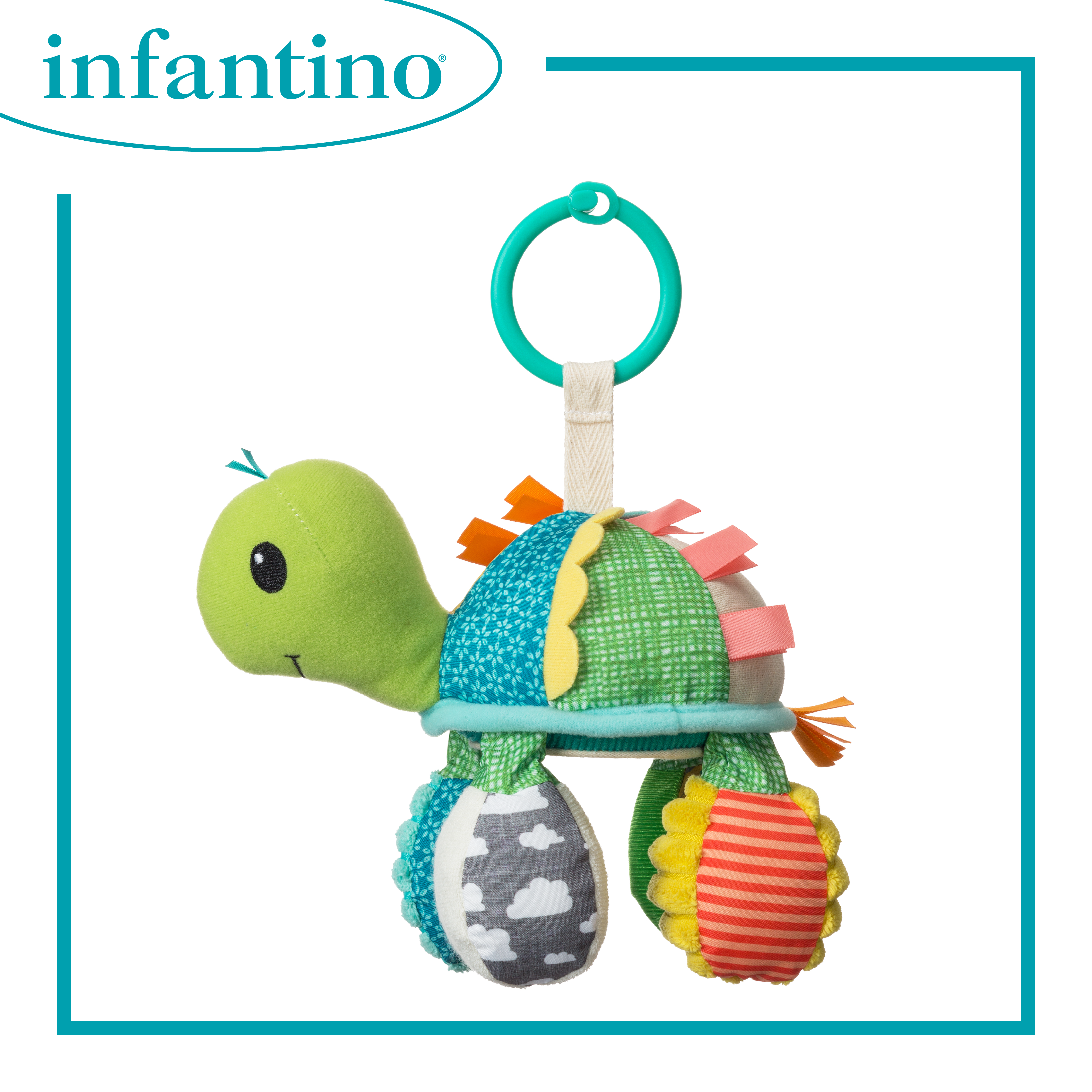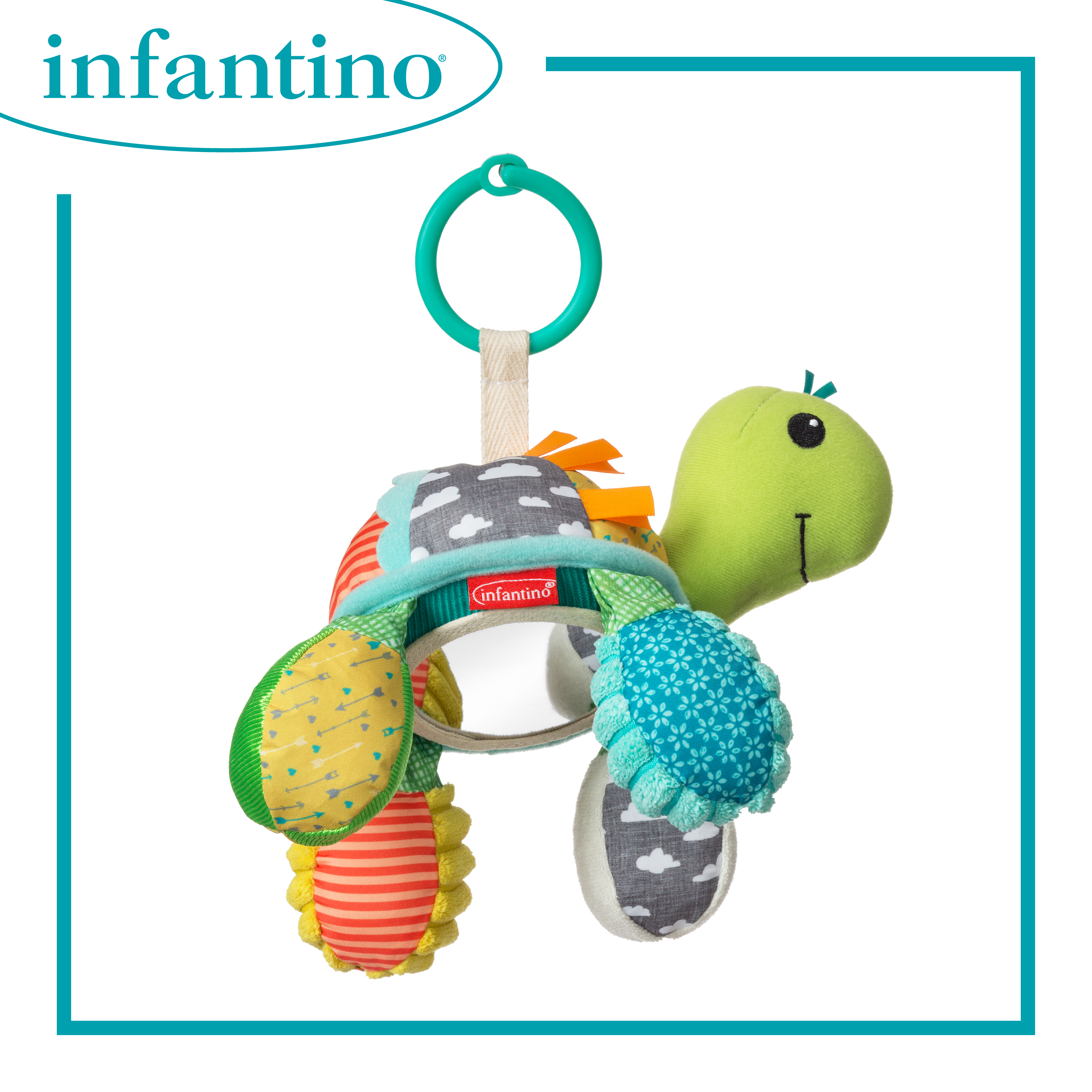 適合初生嬰兒使用 有趣吸引的搖鈴和褶皺聲有助啟發探索 明亮刺激的色彩配搭 帶鏡子的肚子,適合玩躲貓貓遊戲 易於安裝到汽車座椅或嬰兒車上
