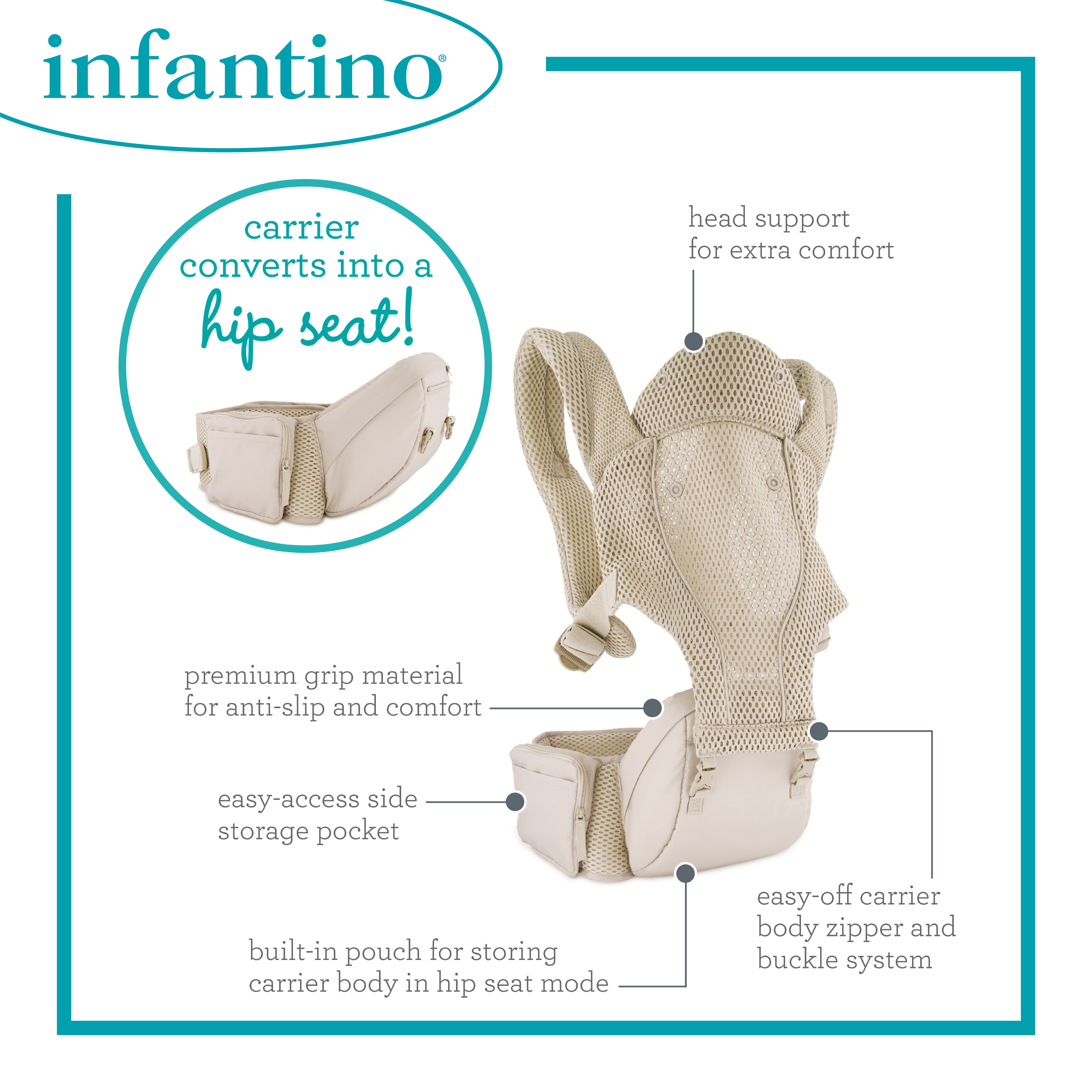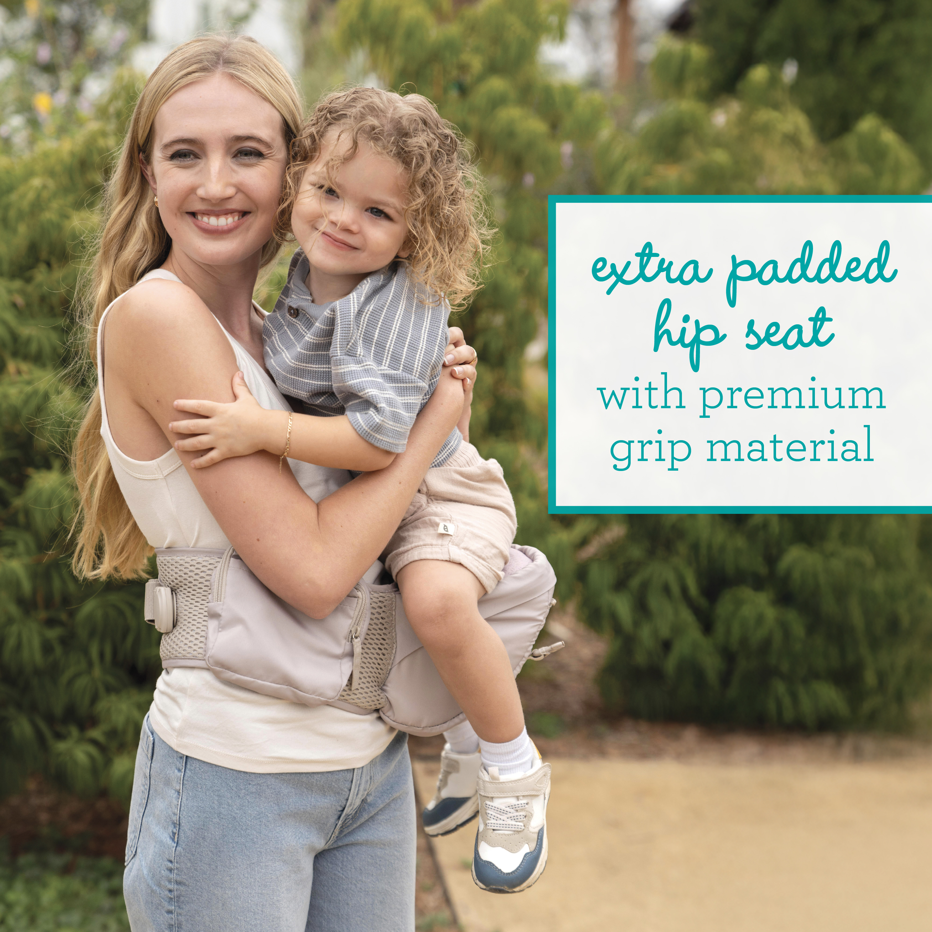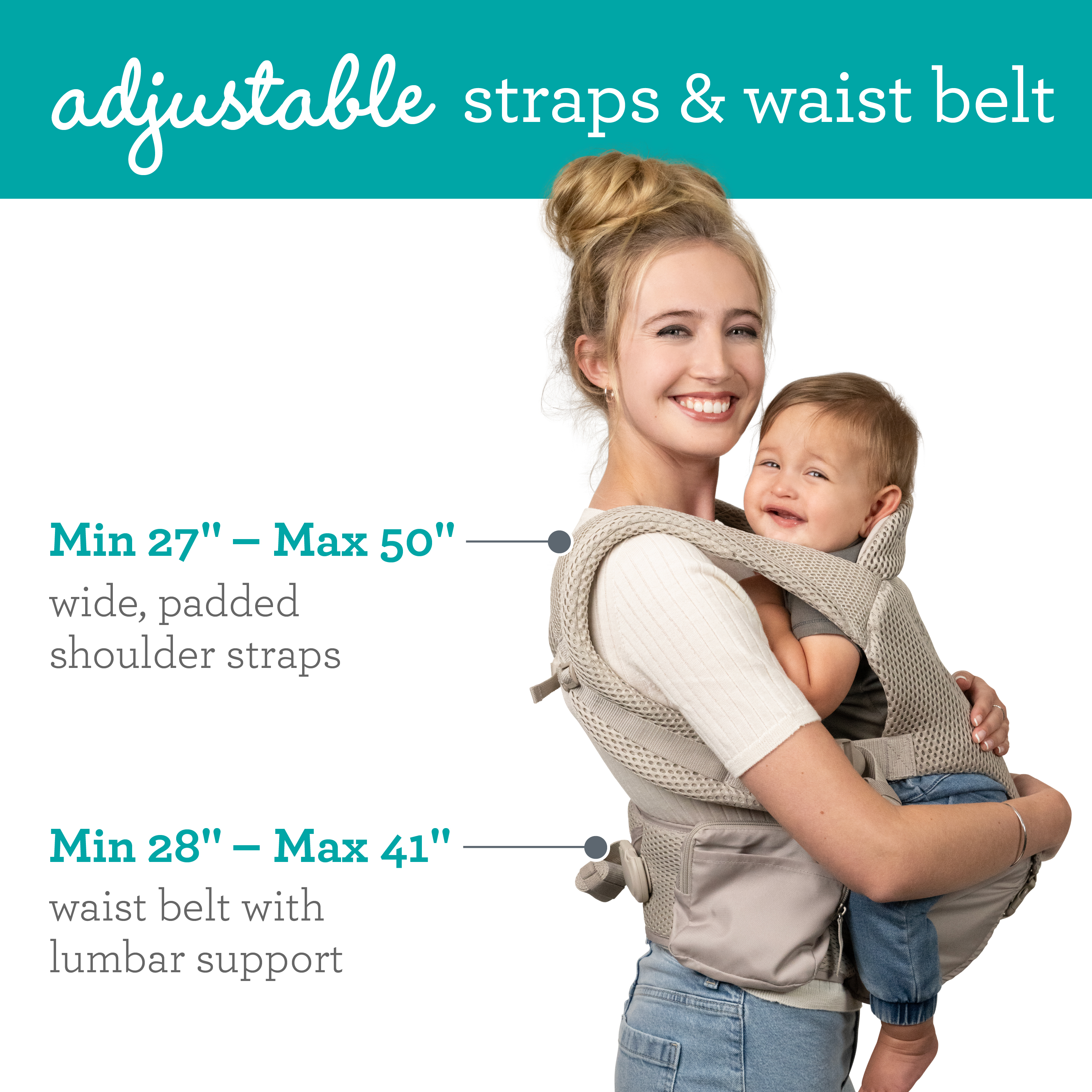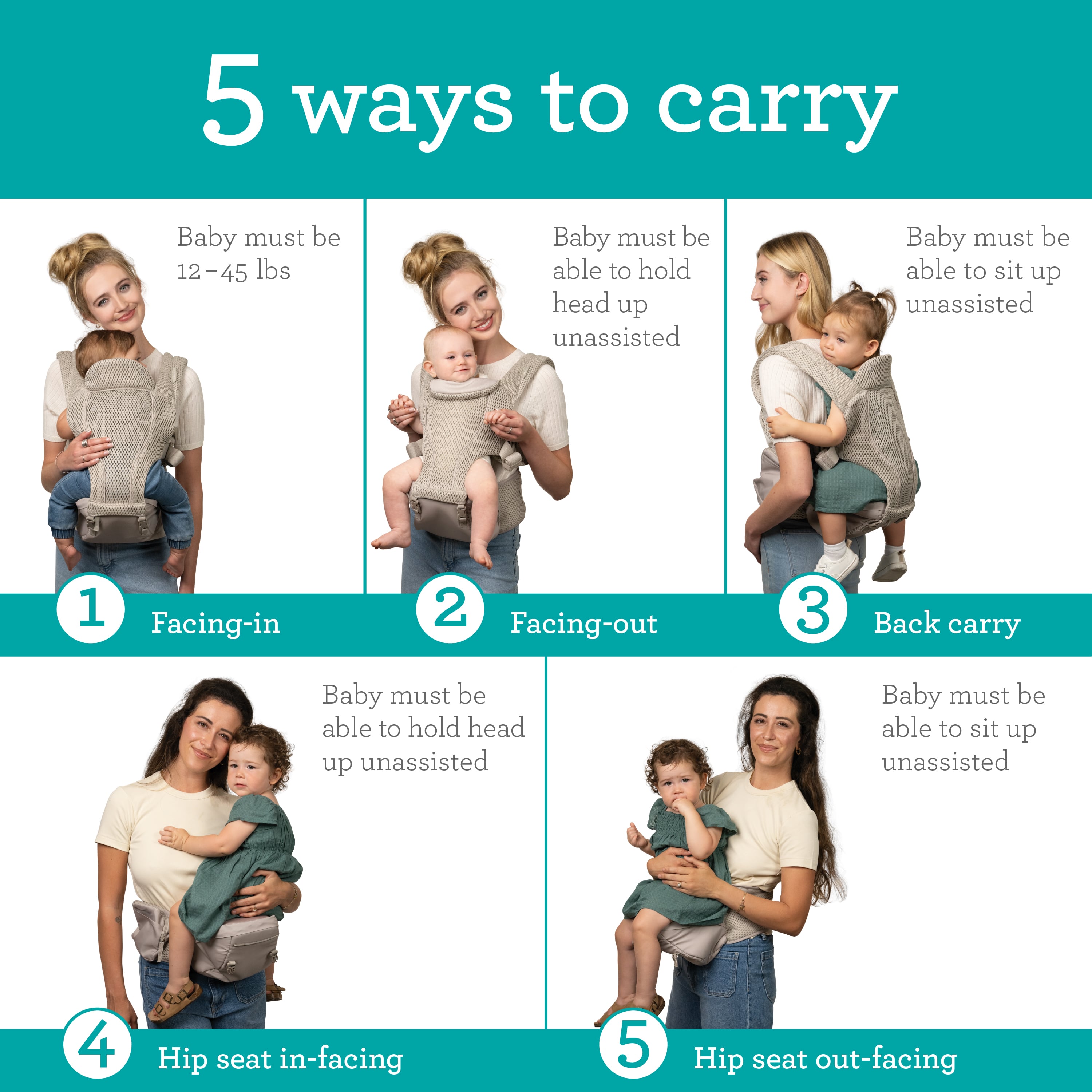 適合 3 個月或以上嬰幼兒使用 可承重 12 - 45 磅 / 5.5 - 20.4 kgs 5種揹法 頭部支撐,份外舒適 帶襯墊的肩帶和支撐腰帶,用於分散重量和緩解壓力 可收納的袋子,增加隨時可由揹帶變作座椅的便攜性 可輕鬆拆卸揹帶主體的易於開/關的拉鍊和帶扣系統 腰帶上有方便、易於拿取的側邊口袋 高級握感物料 - 提供防滑功能及提升舒適度 可調節部分: 可調加寬軟墊肩帶 (最短27吋,最長50吋) 可調節腰部支撐腰帶 (最小 28吋 - 最長41吋)