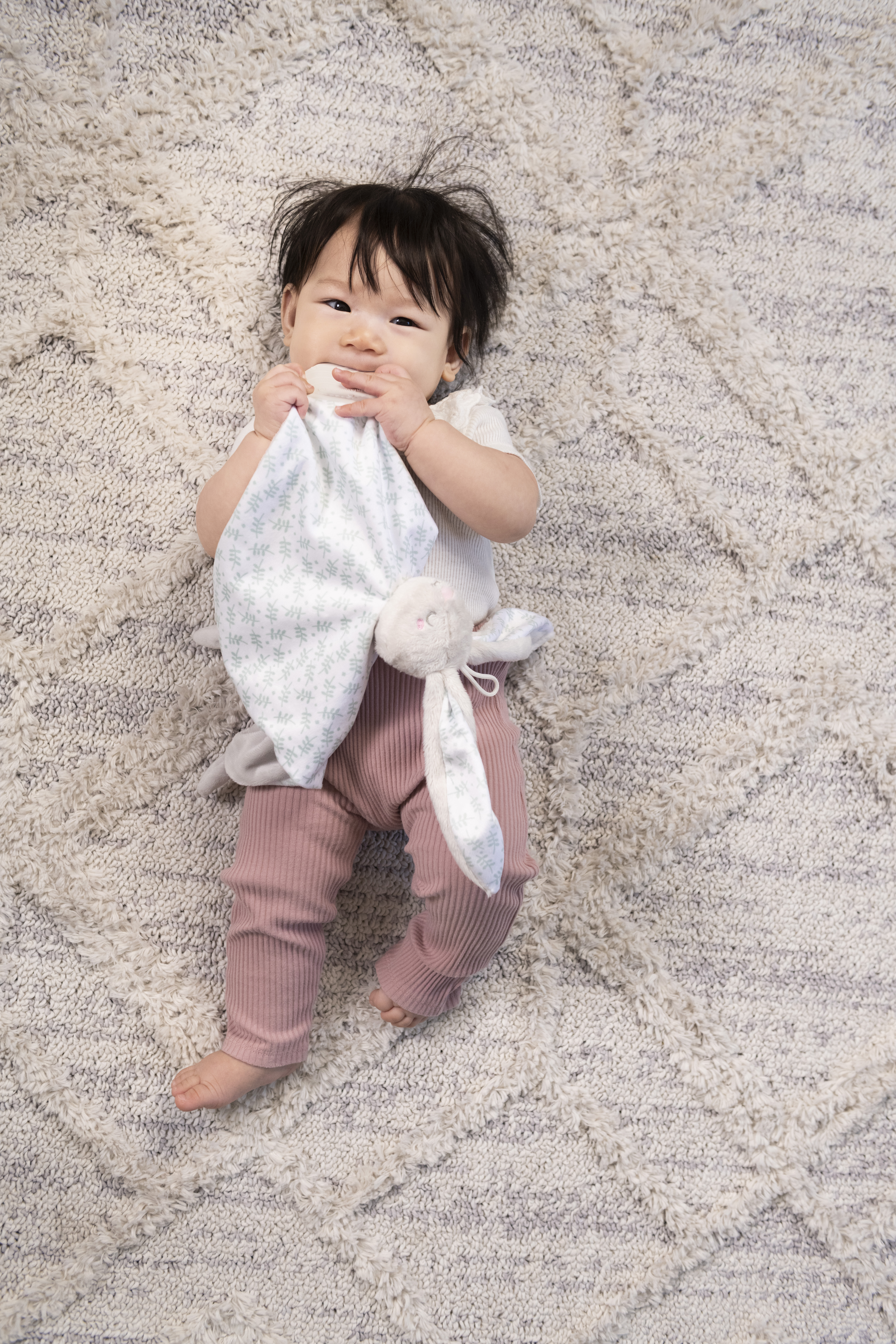 適合初生嬰兒使用 多功能兔子小毛毯,是陪伴寶寶入睡或玩耍的最佳伴侶 牙膠有不同紋理 可以將安撫小毛毯和安撫奶嘴固定在一起,防止遺失 可與任何款式奶咀扣在一起!! 不含BPA